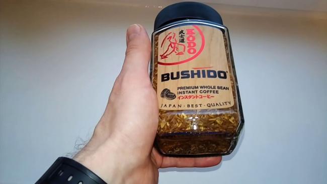 В линейке растворимого кофе Бушидо – это самый крепкий и, пожалуй, самый оригинальный напиток. Зёрна арабики завозят из стран Южной и Центральной Америки. На предприятии они проходят ручную обжарку на дровах, что, естественно, оказывает влияние на вкус готового продукта.