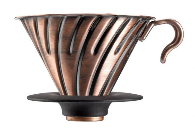 Hario Coffee Dripper V60 VDM-02CP выполнена из металла под медь. Смотрится стильно, практичная и долговечная. Подставка съемная, можно заваривать как в кофейнике с узким горлышком, так и в чашке.